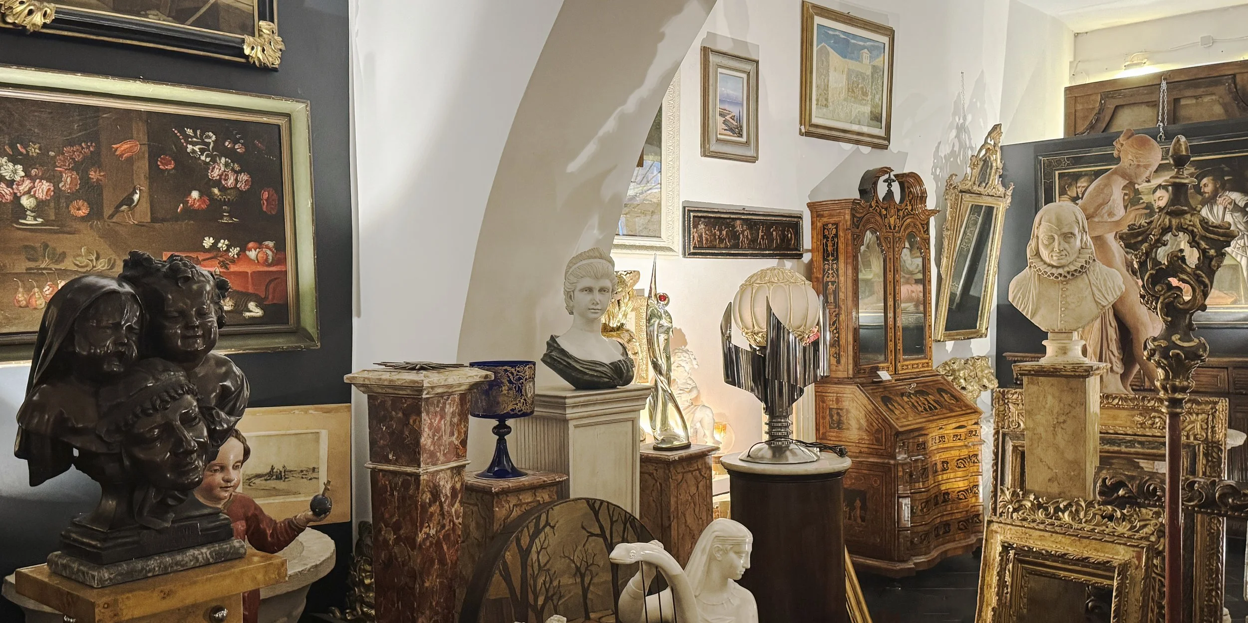 oggetti antichi, ceramiche, bronzi, lampadari, micromosaici;